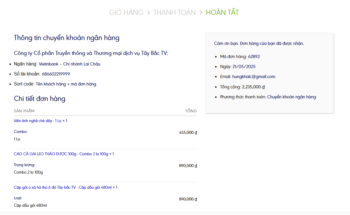 Khi hoàn tất đơn hàng, sẽ hiện thông tin như sau: